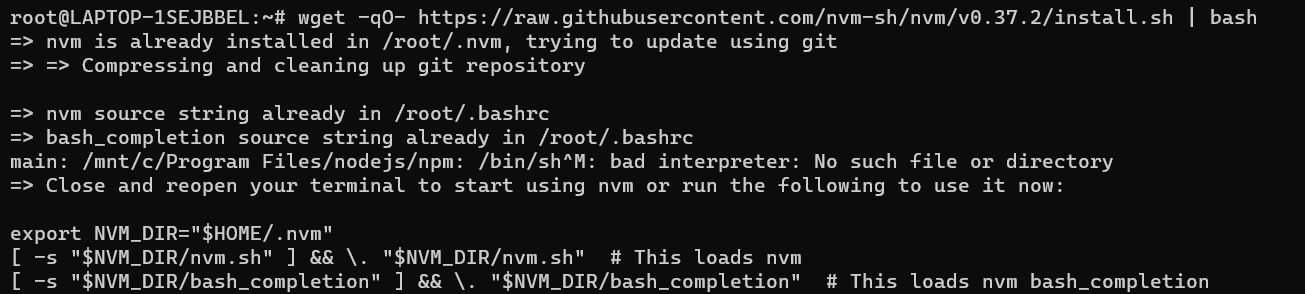 $ wget -qO- https://raw.githubusercontent.com/nvm-sh/nvm/v0.37.2/install.sh | bash