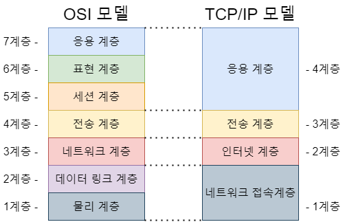 - TCP/IP 모델 : OSI 모델의 7계층 구조를 4계층 구조로 변경한 모델