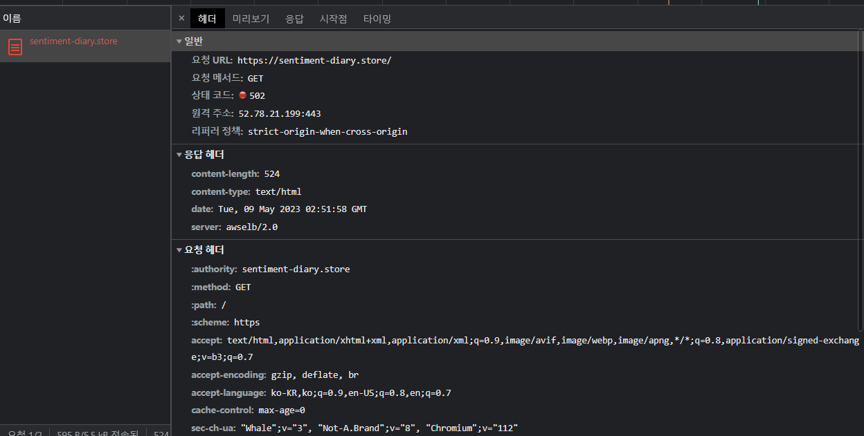 - 발급받은 도메인에 접속하니 502 에러 발생