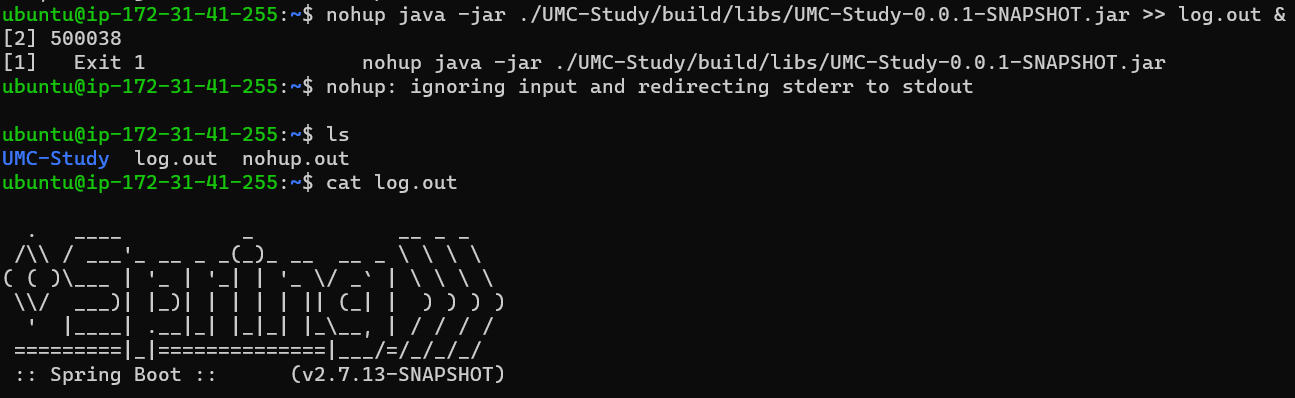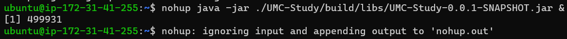 - nohub java -jar 프로젝트명-0.0.1-SNAPSHOT.jar &