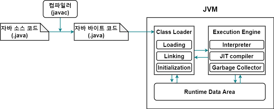 - 메모리 로드 : 클래스 로더(Class Loader)가 바이트 코드를 JVM 내부로 불러 RDA에 적재