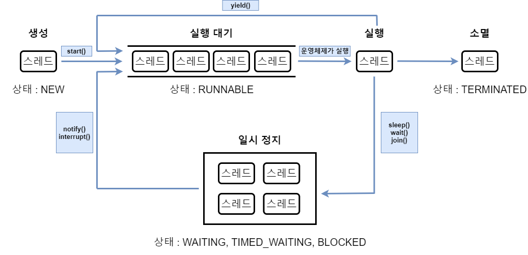 - 일시 정지 : 실행 대기로 가기 전까지 스레드 대기