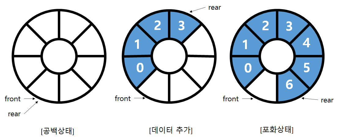 - 포화상태 : front == (rear + 1) % QUEUE_SIZE