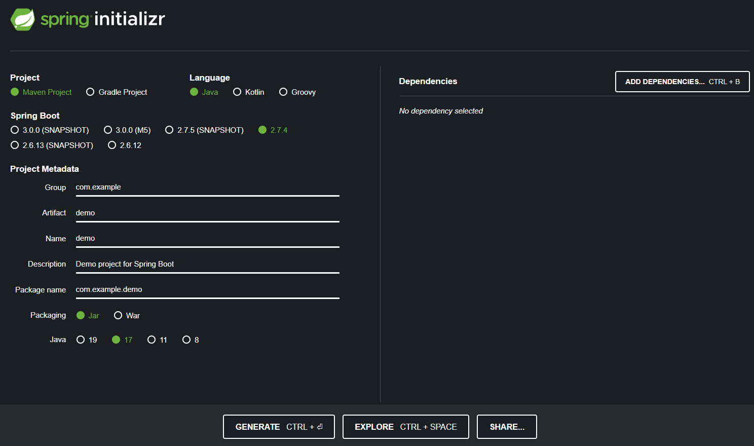 - Spring Initializr 기능(https://start.spring.io/)을 이용 템플릿 프로젝트 생성