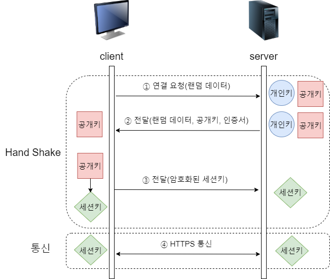 - client와 server는 통신을 할 때 세션키를 통해서 데이터 암복호화를 함